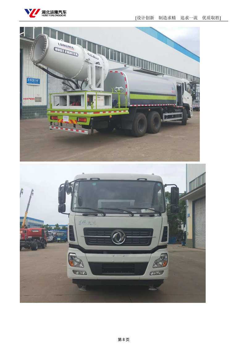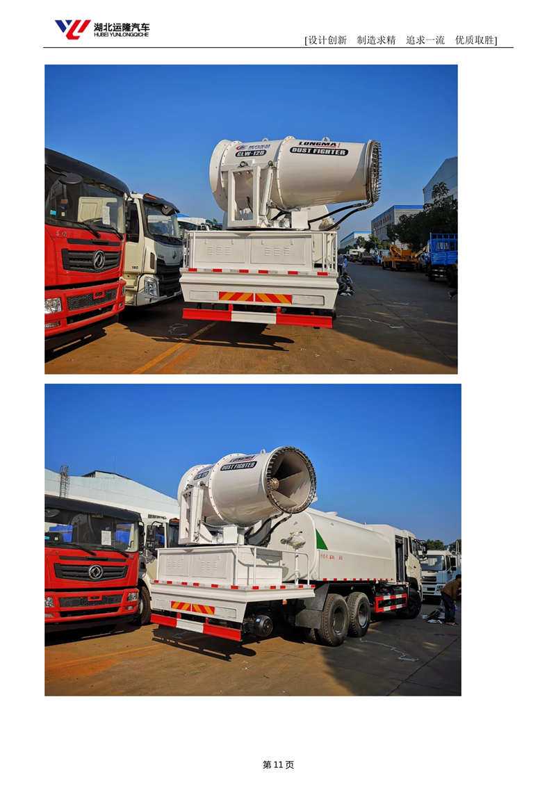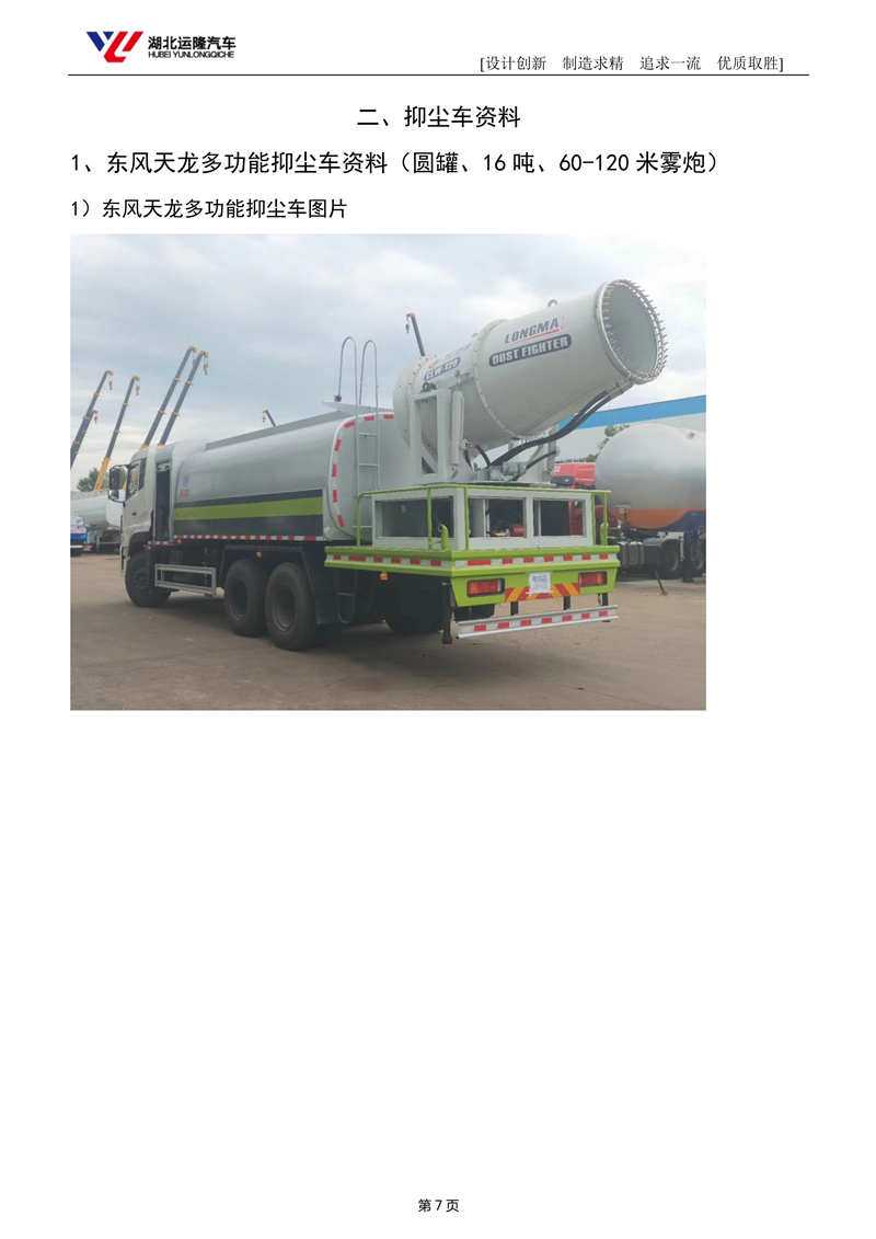 上裝配置:罐體容積為 15-18 立方多功能抑塵灑水車,選配風(fēng)送式霧炮機(jī)組射程50米、60米、80米、100米、120米,罐體鋼板為4mm碳鋼Q235材質(zhì),罐內(nèi)隔板具有防波作用,以減輕汽車行駛時(shí)罐體液體沖擊,罐體及整車外形尺寸按照公告。帶大功率專用灑水泵,泵可自吸自排,整車前沖、后灑、側(cè)噴、帶65消防接口,后平臺(tái)配CLW-50、CLW-60、CLW-80、CLW-100、CLW-120型風(fēng)送式霧炮機(jī)組;罐體前封頭配大功率柴油發(fā)電機(jī)組;遠(yuǎn)程遙控系統(tǒng)控制;霧炮機(jī)自動(dòng)旋轉(zhuǎn)角度0-360°。后平臺(tái)帶綠化灑水炮,灑水炮可全方位旋轉(zhuǎn),可連續(xù)調(diào)成直沖狀、大雨、小雨、毛毛雨;前封頭帶水位計(jì),后平臺(tái)主管路帶1寸澆花接口,后爬梯。帶兩根輸水管及陰陽(yáng)端。罐體顏色:銀/灰/綠,罐體兩側(cè)噴“多功能抑塵車”字樣,貼反光標(biāo)示。
