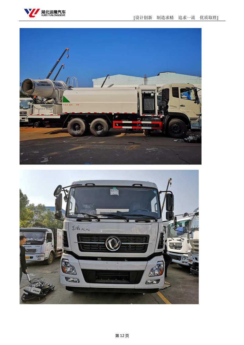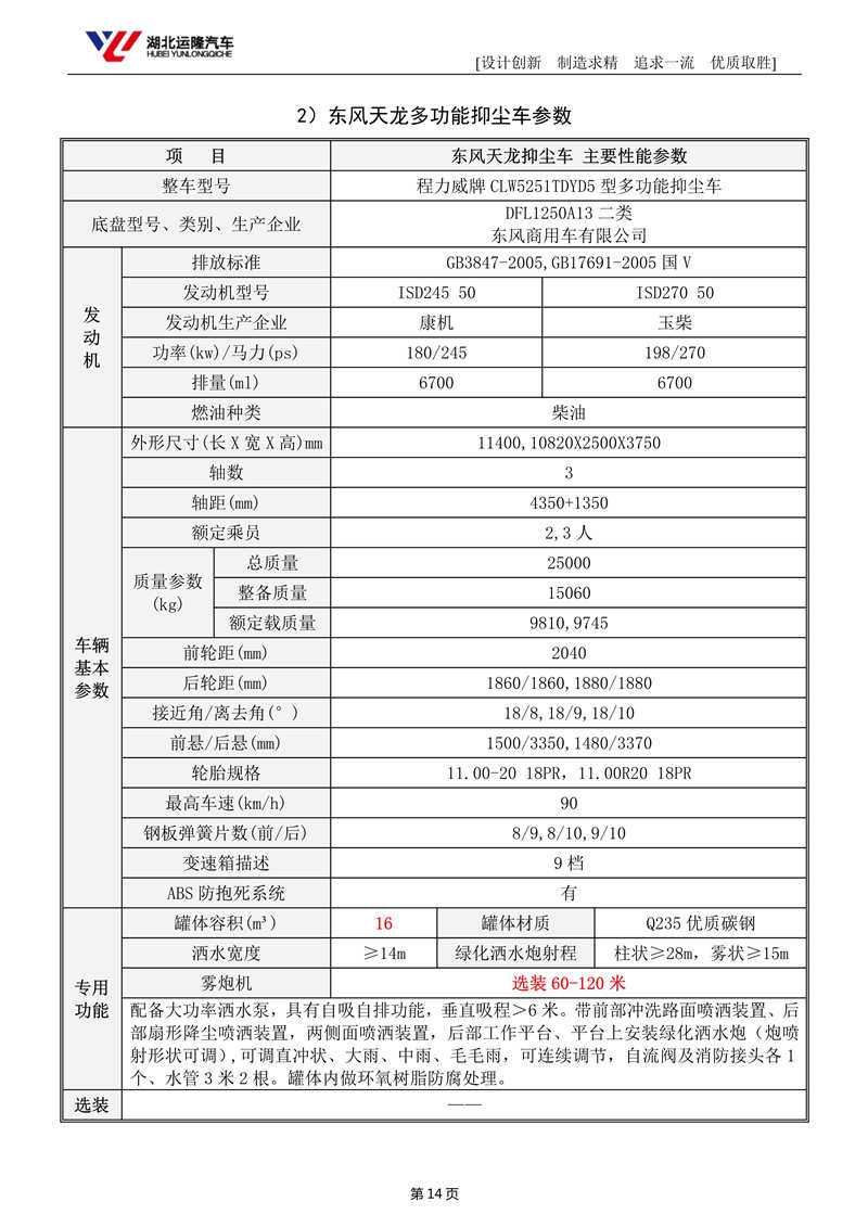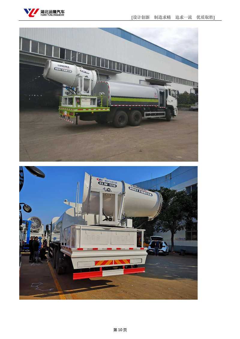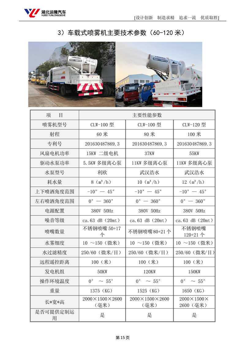 上裝配置:罐體容積為 15-18 立方多功能抑塵灑水車,選配風(fēng)送式霧炮機(jī)組射程50米、60米、80米、100米、120米,罐體鋼板為4mm碳鋼Q235材質(zhì),罐內(nèi)隔板具有防波作用,以減輕汽車行駛時(shí)罐體液體沖擊,罐體及整車外形尺寸按照公告。帶大功率專用灑水泵,泵可自吸自排,整車前沖、后灑、側(cè)噴、帶65消防接口,后平臺(tái)配CLW-50、CLW-60、CLW-80、CLW-100、CLW-120型風(fēng)送式霧炮機(jī)組;罐體前封頭配大功率柴油發(fā)電機(jī)組;遠(yuǎn)程遙控系統(tǒng)控制;霧炮機(jī)自動(dòng)旋轉(zhuǎn)角度0-360°。后平臺(tái)帶綠化灑水炮,灑水炮可全方位旋轉(zhuǎn),可連續(xù)調(diào)成直沖狀、大雨、小雨、毛毛雨;前封頭帶水位計(jì),后平臺(tái)主管路帶1寸澆花接口,后爬梯。帶兩根輸水管及陰陽(yáng)端。罐體顏色:銀/灰/綠,罐體兩側(cè)噴“多功能抑塵車”字樣,貼反光標(biāo)示。