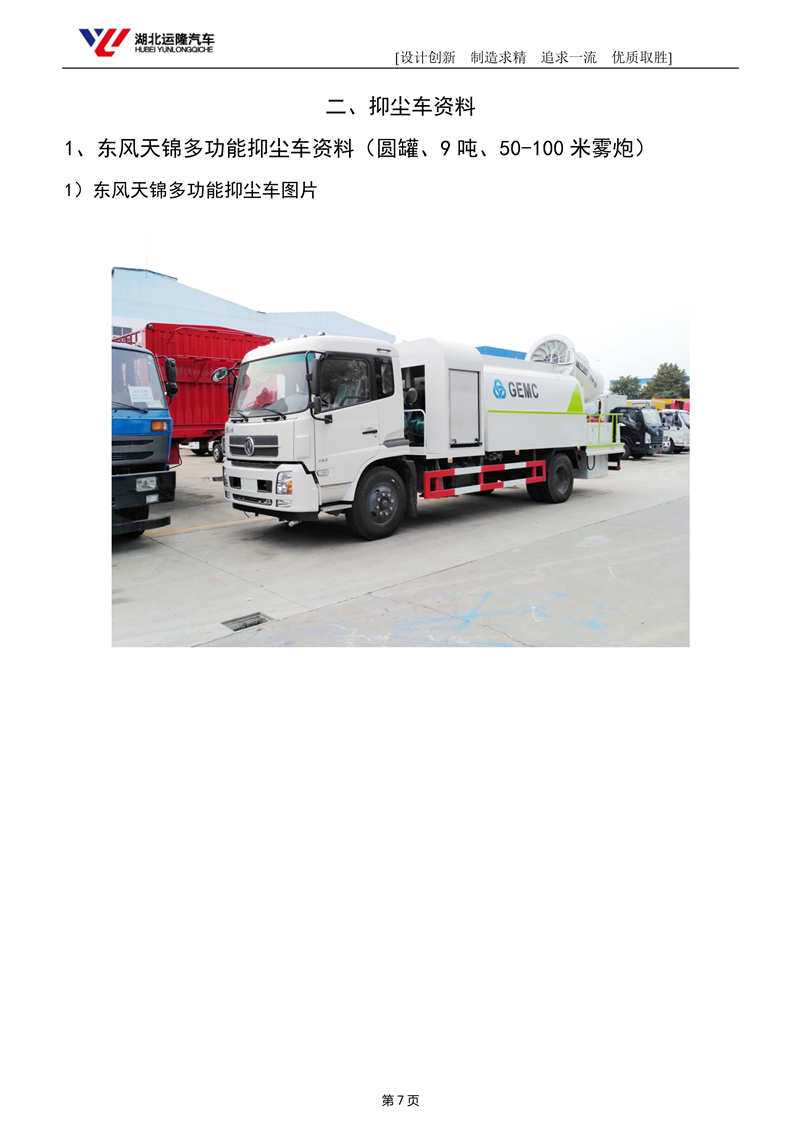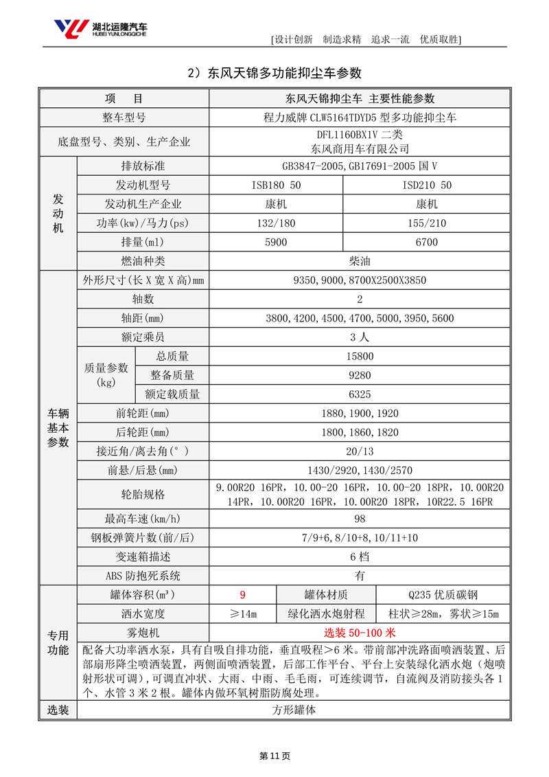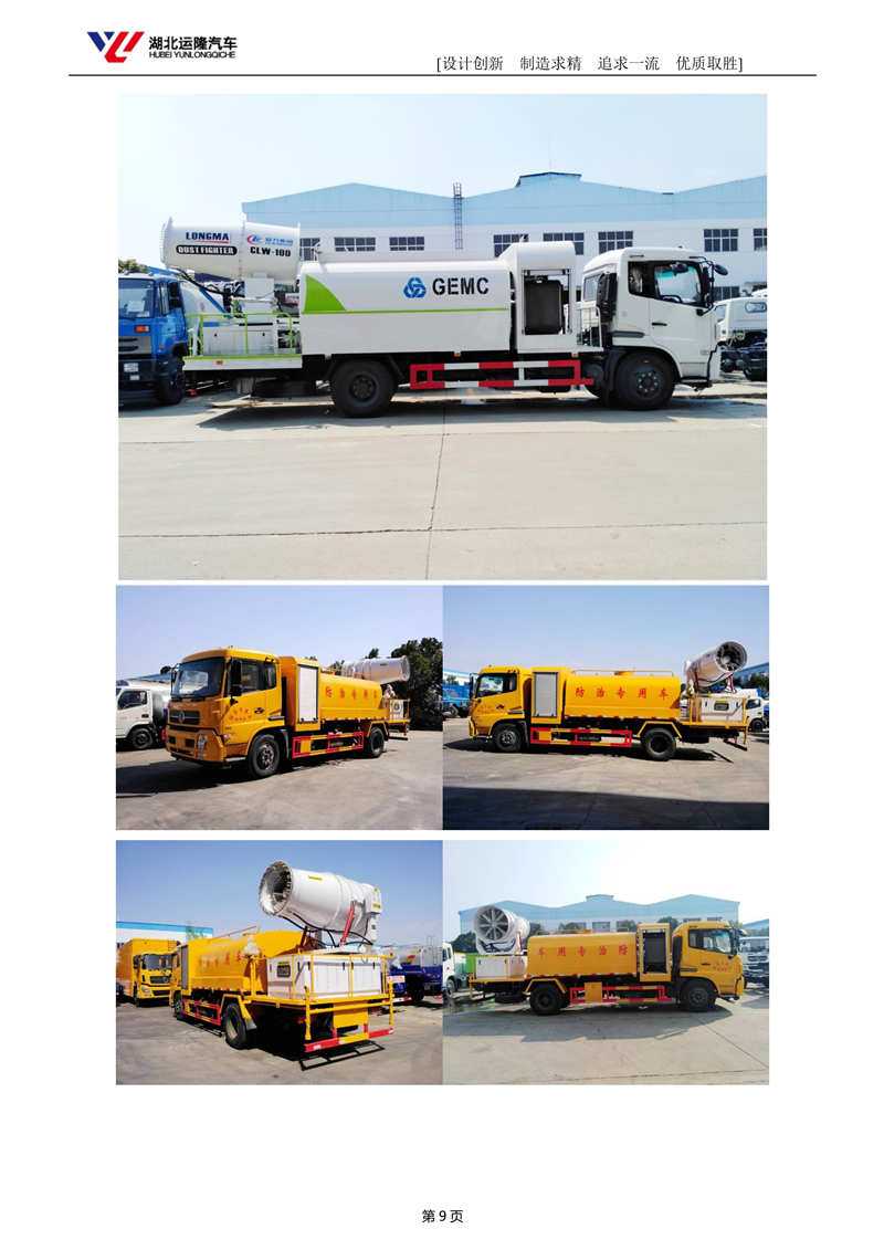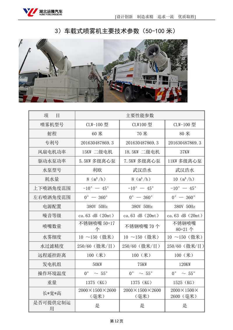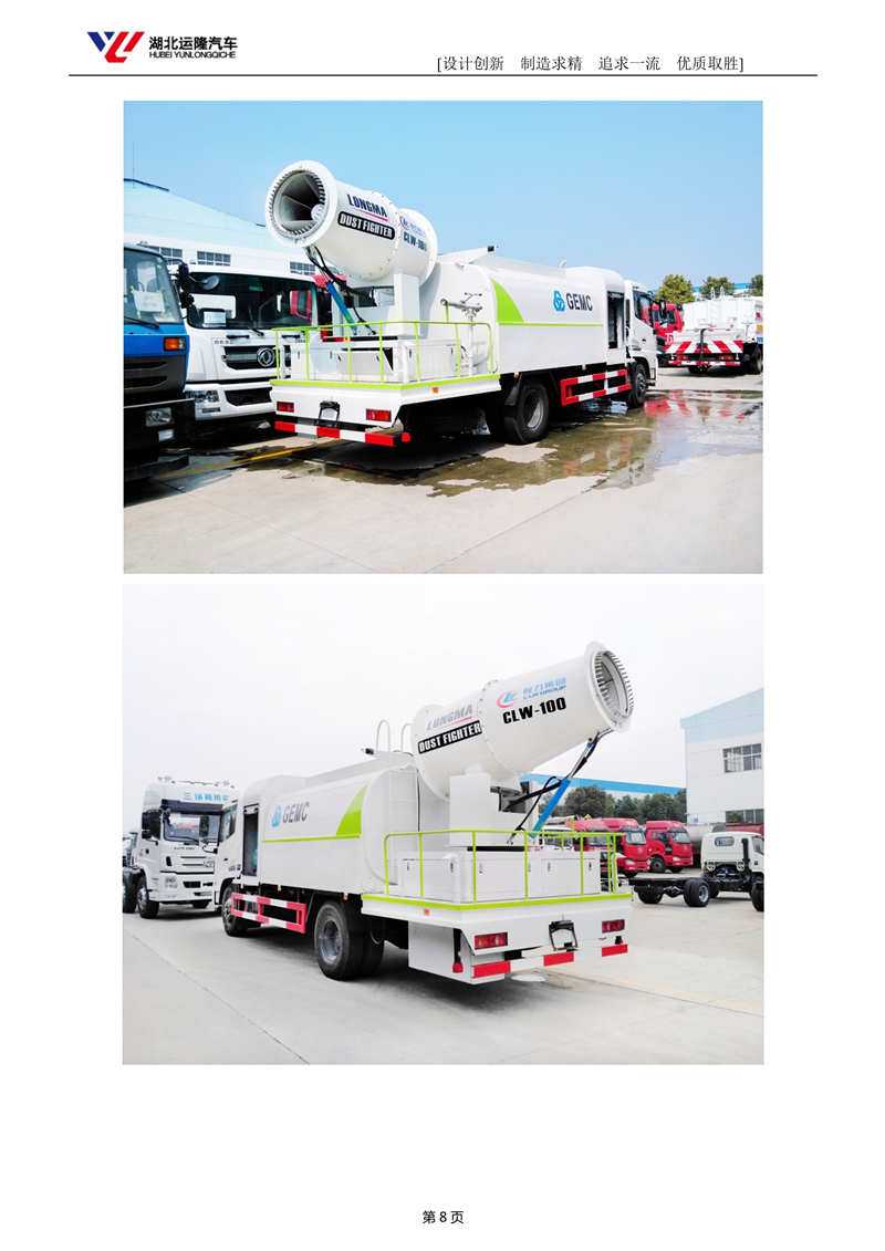 上裝配置:罐體容積為 10-12 立方多功能抑塵灑水車,選配風(fēng)送式霧炮機(jī)組射程50米、60米、80米,罐體鋼板為4mm碳鋼Q235材質(zhì),罐內(nèi)隔板具有防波作用,以減輕汽車行駛時(shí)罐體液體沖擊,罐體及整車外形尺寸按照公告。帶大功率專用灑水泵,泵可自吸自排,整車前沖、后灑、側(cè)噴、帶65消防接口,后平臺(tái)配CLW-50、CLW-60、CLW-80型風(fēng)送式霧炮機(jī)組;罐體前封頭配大功率柴油發(fā)電機(jī)組;遠(yuǎn)程遙控系統(tǒng)控制;霧炮自動(dòng)旋轉(zhuǎn)角度0-360°。后平臺(tái)帶綠化灑水炮,灑水炮可全方位旋轉(zhuǎn),可連續(xù)調(diào)成直沖狀、大雨、小雨、毛毛雨;前封頭帶水位計(jì),后平臺(tái)主管路帶1寸澆花接口,后爬梯。帶兩根輸水管及陰陽(yáng)端。罐體顏色:白/蘭,罐體兩側(cè)噴“多功能抑塵車”字樣,貼反光標(biāo)示。
